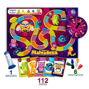 Conteúdo: 1 Jogo de Tabuleiro Senhor Malvadeza com 6 Pinos, 1 Roleta, 1 Ampulheta, 111 Cartas e 1 Tabuleiro em