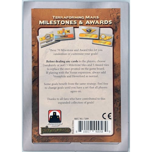 Stronghold Games Terraforming Mars Milestones and Awards - Jogo de tabuleiro de estratégia - para 1 a 5 jogadores e maiores de 12 anos - Novos marcos: alcançar objetivos significativos como "Terraformer" e "Gardener", recompensando o planejamento estratégico e o gerenciamento de recursos. - Prêmios dinâmicos: competir por vários prêmios com base em suas contribuições para o desenvolvimento de Marte, incluindo o "Best Builder" e "Best Terraformer" - Jogabilidade aprimorada: adicione novas camadas de competição e emoção enquanto você se esforça para ofuscar seus oponentes enquanto avança no ambiente de Marte.