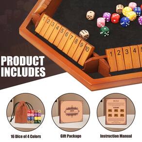 Toidgy 1 a 6 jogadores Shut The Box Jogos de dados, jogo de matemática de mesa de madeira com 16 dados e instruções, jogo de tabuleiro clássico feche a caixa para adultos, crianças, sala de aula familiar, casa ou bar - Jogo de tabuleiro para 6 jogadores: este jogo profissional de madeira é um jogo de dados clássico com jogabilidade simples e pode ser jogado por até 6 jogadores ao mesmo tempo, proporcionando diversão sem fim. Vem com 16 dados (2 dados por pessoa + 4 dados sobressalentes), uma bolsa de armazenamento de dados, um manual de instruções e uma caixa de presente, tornando-o um dos jogos de matemática mais populares. - Requintado e resistente: a requintada tecnologia de tingimento sólido não desbota ou cai, a almofada de feltro preta macia pode reduzir o ruído, além de uma caixa de presente requintada a torna o melhor presente para familiares e amigos em aniversários, Natal, Ano Novo e presentes de aniversário. Feito de madeira natural de alta qualidade, tem excelente durabilidade e robustez e pode ser utilizado repetidamente por muitos anos. - Melhor jogo de festa: este jogo de dados de madeira para família é um ótimo jogo de entretenimento social interno e externo, perfeito para escola, família, piqueniques, festas, aniversários, bares, festas sociais ou em qualquer outro lugar. Brincar com várias pessoas trará mais diversão e desafios, ajudará a construir bons relacionamentos, cultivar sentimentos e permitir que você passe todos os bons momentos com sua família ou amigos. - Simples de jogar: cada jogador se reveza, jogando os dados e colocando as peças de acordo com a soma dos números dos dados. Quando alguém fecha todas as peças, o jogo termina e o jogador ganha. O jogo termina quando alguém fecha todas as peças e o jogador ganha. Se um jogador não puder colocar mais peças com base no valor do rolo, conte o valor das peças restantes que ainda estão viradas para cima e o jogador com a pontuação mais baixa ganha. Este requintado jogo de fechar a caixa proporcionará horas de diversão onde quer que você vá. - Melhore o pensamento matemático: este é um presente ideal para quem gosta de jogos educativos e pensamento matemático. Melhora a capacidade de aprendizagem de adição, subtração, multiplicação e divisão matemáticas através da combinação de cálculos numéricos. Também é um jogo educativo adequado para crianças e idosos. Você pode personalizar as regras do jogo, exercitar seu pensamento matemático, reação e habilidades lógicas e experimentar a tensão e a emoção dos jogos de números com sua família e amigos.