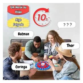 Caracteristicas: - Acompanha 36 cartas com 72 temas - Marca: braskit - 1 Tecla - Idade minima: +8 anocs - Quantidade maxima de jogadores: 8 - Registro Inmetro: 000627/2024 - Medidas: 24cm (diametro) 7cm (altura) - Modelo da pilha : AA