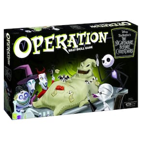Jogo de tabuleiro Operation Disney The Nightmare Before Christmas | Jogo de operação colecionável | Com ilustrações de Oogie Boogie e Nightmare Before Christmas, para mais de 1 jogador - O PACOTE INCLUI: jogo Operation The Nightmare Before Christmas - 17" x 10" - Design clássico: este conjunto clássico de jogos The Nightmare Before Christmas apresenta Oogie Boogie como paciente pronto para Funatomy com um conjunto completo de suprimentos cirúrgicos. - PERFEITO PARA QUALQUER OCASIÃO: este jogo de tabuleiro é uma atividade perfeita durante festas de Halloween, aniversários e ideias de atividades de união familiar. - MATERIAIS DE ALTA QUALIDADE: Este conjunto de jogos de tabuleiro é feito de materiais de papel de alta qualidade que são duráveis e podem durar uso contínuo. - LEMBRETES: Este conjunto de jogos de festa contém peças pequenas que correm o risco de asfixia se ingeridas. A supervisão de um adulto é necessária para crianças menores de 3 anos.