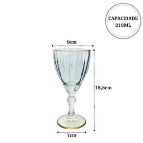 Infomações Técnicas: Composição: Vidro. Capacidade: 210ml. Altura: 18,5cm. Diâmetro da borda: 9cm. Diâmetro da base:7cm. Peso: 314 gramas cada taça. Validade: Indeterminada.
