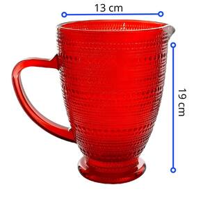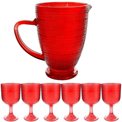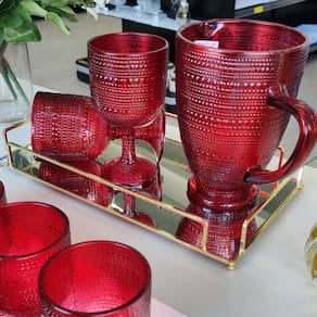 • Marca: Kehome • Linha: Pérola • Conteúdo da Embalagem: 6 Taças + 1 Jarra • Capacidade da Taça: 390 ml • Capacidade da Jarra: 1370ml • Material do produto: Vidro • Cor: Vermelho • Indicação de uso: Água, suco e refrigerante