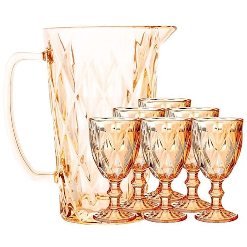 Especificações: Material: - Vidro Cor: - Âmbar Metalizada Capacidade da taça:- 340ML Capacidade da jarra:- 1 Litro Pacote contém: - 7 Unidade Aviso: - Imagem meramente ilustrativa Garantia: - 90 dias contra defeito de fabricação.