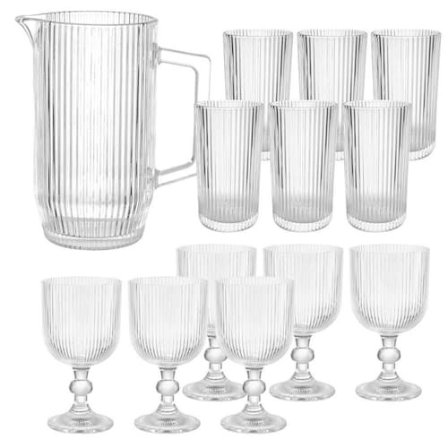 O jogo é composto por 6 Taças de 370ml, 6 Copos de 420ml e uma Jarra de 1,2 litros de capacidade, são ideais para você servir água, sucos ou drinks de sua preferência, possui alça e bico fino facilitando o despejo das bebidas. O vidro espesso garante uma ótima durabilidade e ajuda a manter a temperatura de sua bebida por mais tempo.