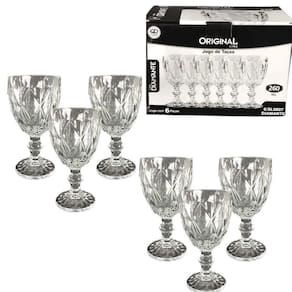 As peças possuem um belo design decorado por linhas, delicados ornamentos e formas em relevo, detalhes que acrescentam muito charme e elegância ao ambiente onde estiverem expostas; As taças harmonizam com qualquer bebida, podem ser usadas para servir água, suco e variados tipos de drinks; Conteúdo da Embalagem: 06 Taças Vidro Diamond Vidro Especificações do Produto: Cor: Transparente Altura: 15 cm Diâmetro: 8 cm Capacidade: 260ml Diâmetro da boca: 8 cm Material: Vidro Bebidas recomendadas: Água, Vinho, Sucos, Refrigerantes Dimensões Da Embalagem: Altura: 18cm Largura: 26cm Profundidade: 18cm Peso: 1910G do vendedor: 30 dias Embaladas individualmente para evitar danos durante o transporte Ean: 7898062607380