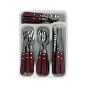 Especificações: - Material: Madeira e Inox - Medida Porta Talher: 21cm x 29cm - Medida Colher de Mesa: 15cm cada - Medida Colher de Sobremesa: 19cm cada - Medida Garfo de Mesa: 19cm cada - Medida Faca de Churrasco: 21cm cada - Porta Talher com Divisórias ===================================== Devido à diferença entre monitores e iluminação diferentes, pode haver variação na tonalidade apresentada no anúncio. Medidas muito aproximadas. Marca: Não Informado