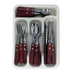 Design sofisticado em inox que traz elegância à sua mesa Cabos em madeira para maior durabilidade e conforto no manuseio Conjunto completo com 24 peças para atender todas as suas necessidades Divisória prática no porta talheres para manter tudo organizado Perfeito para churrascos, jantares e ocasiões especiais