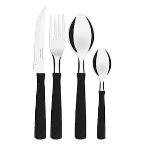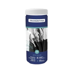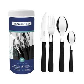Jogo de Talheres 24 Peças Tramontina New Kolor 23198093 Preto - Características Gerais do Produto: Material: Aço Inox e Polipropileno Linha: New Kolor Pegador / Cabo: Polipropileno Pode ir à Maquina de Lavar Louças: Sim Tratamento do Talher: Facas com tratamento térmico Acompanha o produto: 6 Colheres de Mesa 6 Colheres para Chá 6 Facas para Churrasco 4 6 Garfos de Mesa 1 Pote Plástico : 90 dias junto ao fabricante Marca: Não Informado Ean: 7891112349476