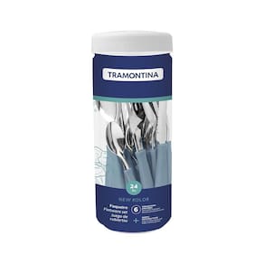 Jogo de Talheres 24 Peças Tramontina New Kolor 23198693 Azul - Características Gerais do Produto: Material: Aço Inox e Polipropileno Linha: New Kolor Pegador / Cabo: Polipropileno Pode ir à Maquina de Lavar Louças: Sim Tratamento do Talher: Facas com tratamento térmico Acompanha o produto: 6 Colheres de Mesa 6 Colheres para Chá 6 Facas para Churrasco 4 6 Garfos de Mesa 1 Pote Plástico : 90 dias junto ao fabricante