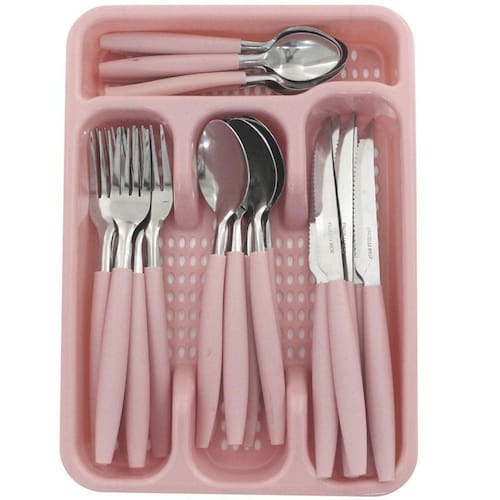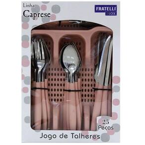 O Conjunto de Talheres da linha Caprese da Fratelli Inox é fabricado em aço inox e plástico resistente. Possui design anatômico, é durável, higiênico e fácil de limpar. Acompanha suporte organizador de talheres para gaveta. Especificações Técnicas: Material: 50% inox / 50% polipropileno Cor: Rosa Composição: - 6 facas de churrasco - 6 garfos de mesa - 6 colheres de mesa - 6 colheres de sobremesa - 1 porta talheres em plástico Medidas: 4 x 21,3 x 30 cm (A x L x C) Peso: 643g Ean: 7899110658118