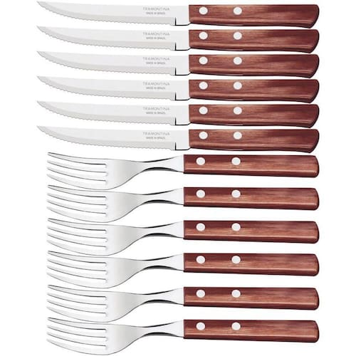 Jogo De Talheres Para Churrasco Em Aço Inox Cabo Vermelho Polywood 12 Peças Tramontina 21199/711 Descrição: A rusticidade dos cabos em madeira é perfeita para talheres de churrasco, mas junção desse material com cores diferenciadas é melhor ainda. Sendo a melhor opção para que seus convidados desfrutem do churrasco da melhor forma possível, os talheres são confeccionados em aço inox, material que é garantia de resistência, beleza, higiene e durabilidade. Os cabos, em madeira tratada Polywood, que oferecem um design diferenciado e beleza para qualquer ocasião, são resistentes à impactos e altas temperaturas. Além disso, podem ir à maquina de lavar louças. Lâminas de aço inox. As lâminas das facas têm maior durabilidade do fio devido ao tratamento térmico. As lâminas dos garfos contam com maior espessura e uma estampagem do aço que garante maior resistência, evitando deformações. Os cabos de madeira tratada Polywood são resistentes à impactos e alta temperaturas garantindo maior resistência e durabilidade. Rebites de alumínio. Podem ir à máquina de lavar louças facilitando seu dia a dia. Contém: 21100075 Faca para churrasco 6 peças 21102070 Garfo de mesa 6 peças Importante: Tenha cuidado ao manusear produtos cortantes e perfurantes e mantenhaos fora do alcance das crianças. Para maior durabilidade dos produtos recomendase secar bem antes de guardar. Para descarte dos produtos e embalagens siga as orientações de reciclagem vigentes. EAN 7891112015647 DUN 17891112015644 NCM 8215.20.00 Peso Líquido: 0,3870 Kg Peso Bruto: 0,4700 Kg Metragem Cúbica: 0,002839 m3 Dimensões Produto: (Comp. X Larg. X Alt.): 0 X 0 X 0 mm Dimensões Embalagem: (Comp. X Larg. X Alt.): 38 X 225 X 332 mm