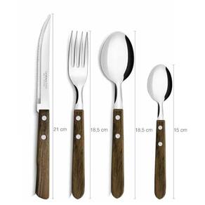 Jogo de Talheres Cucina Mia Cabo de Madeira 24pçs Faqueiro Simonaggio. #Talheres Simonaggio #Cabo de madeira #Design clássico Garantia: 90 dias / Peso: 808g / Cor: inox e madeira / Ref: 7896211815341 Dimensões do garfo: 18,5cm (C) x 2cm (L) Dimensões da faca: 21cm (C) x 2cm (L) Dimensões da colher de sopa: 18,5cm (C) x 2cm (L) Dimensões da colher de café: 1cm (C) x 1,5cm (L) Conteúdo: 06 garfos, 06 facas, 6 colheres de sopa e 6 colheres de café. Cuidados: Não lavar com materiais abrasivos; Lave-os com esponja macia e sabão ou detergente neutro. Compatível com lava louças. Material: - Madeira: cabo dos talheres; - Aço inox: lâmina com material altamente resistente à ferrugem mantém o fio por muito tempo e possui grande durabilidade. O jogo de talheres Simonaggio é composto por 24 peças. Os talheres são produzidos com cabo em madeira e lâmina em aço inox, que oferece maior resistência e durabilidade. Seu design rústico, combina com qualquer cozinha, à tornando ainda mais clássica e bonita. Os talheres com cabo de madeira são de fácil limpeza e podem ser levados à máquina de lavar louças. Complete facilmente sua cozinha com esse conjunto de talheres Simonaggio.
