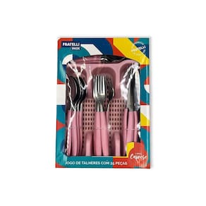 Jogo De Talheres Faqueiro Aço Inox Com Gaveteiro - Rosa O nosso porta talheres de gaveta é ideal para você, um produto que alinha organização a modernidade. Além de contar com um design sofisticado de inox seus cabos são produzidos com polipropileno proporcionando maior durabilidade e controle durante o manuseio. Junto com as 24 peças de talheres que são compostos por 6 facas, 6 garfos, 6 colheres e 6 colheres de chá, o nosso jogo vem com um porta talher de gaveta que além de manter sua gaveta ou balcão organizado também é versátil ao servir como um escorredor dos talheres, um jogo completo. Suas dimensões são: Facas: Comprimento 22,2 cmGarfo: Comprimento 20,1 cmColher De Mesa: Comprimento 19,5 cmColher De Sobremesa: Comprimento 15 cm