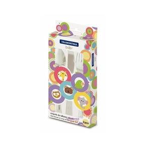 Talheres com formato ergonômico e com variação de desenhos, especialmente criados para incentivar e auxiliar no desenvolvimento das crianças.