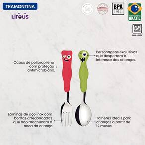 Com o jogo de talheres infantil Tramontina Lirous colorido 02 peças você irá proporcionar uma refeição muito mais agradável e cheia de diversão para os pequenos. Os talheres são produzidos com lâminas em aço inox e cabos de polipropileno, o que lhes proporciona alta resistência e durabilidade. Eles ainda são coloridos e vão estimular ainda mais os sentidos das crianças! Orientações Lâminas de aço inox com bordas arredondadas que não machucam a boca da criança.Cabos de polipropileno que possuem maior resistência e durabilidade. Talheres com proteção antimicrobiana incorporada no processo de injeção que dura por toda vida útil do produto, inibindo o crescimento de bactérias e fungos. Podem ir a máquina de lavar louças, facitando a limpeza. Produtos Livre de BPA: O Bisfenol-A é um componente químico usado na produção de alguns plásticos como o Policarbonato. Este componente pode ser prejudicial à saúde e por isso a Tramontina não o utiliza em seus produtos. Características Gerais EAN13 7891112302204 DUN14 17891112302201 NCM 8215.20.00 Peso Líquido 0,0600 kg. Peso Bruto 0,0800 kg. Metragem 0,000578 m³. Dimensões Embalagem (Compr. X Larg. X Alt.) 105x 20x 275 mm. Observações Recomenda-se o uso destes produtos para crianças com 12 meses ou mais. Tenha cuidado ao manusear o garfo por ser produto perfurante. Antes da primeira utilização, lave bem as peças e seque-as. Estes produtos podem ir à máquina de lavar, porém não recomendamos usar produtos abrasivos como saponáceos, esponjas rígidas ou palhas de aço. Seque-os bem antes de guardar. Para descarte dos produtos e embalagem siga as orientações de reciclagem vigentes.Atenção: Por razões de segurança e saúde do seu filho, utilizar sempre os produtos com supervisão de um adulto. Não utilize os produtos caso apresentarem dano ou defeito. Verifique sempre a temperatura do alimento antes da alimentação.