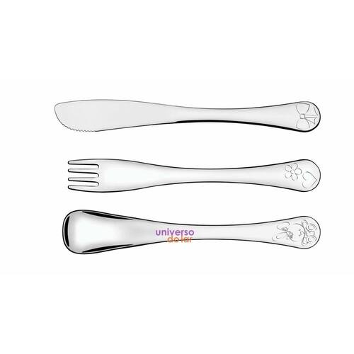Jogo de Talheres Infantil Tramontina em Aço Inox Meninas Acabamento Brilho com Desenho em Alto Relevo 3 Peças A linha Le Petiti traz o Jogo de Talheres Infantil Tramontina em Aço Inox Meninas Acabamento Brilho com Desenho em Alto Relevo 3 Peças. Um jogo muito fofo e que deixará as refeições dos pequenos ainda mais divertidas. Os talheres foram desenvolvidos de forma ergonômica, visando facilitar o manuseio e incentivar a autonomia, contando com detalhes gravados em alto relevo para possibilitar um momento cheio de criatividade e alegria. As peças são produzidas totalmente em aço inox, garantindo a segurança dos seus filhos, pois não solta nenhum resíduo nos alimentos, mantendo-os saudáveis. Informações Gerais A linha Le Petit é delicada e funcional, inspirada pelos brinquedos das crianças. O melhor da infância para brincar também na hora da refeição.Totalmente feitos de aço inox, por isso não soltam nenhum resíduo nos alimentos, mantendo-os saudáveis. Altamente duráveis mantêm suas características originais, preservando a beleza, a higiene e a durabilidade do material. Talheres com formato ergonômico e com variação de desenhos, especialmente criados para incentivar e auxiliar no desenvolvimento das crianças. Acabamento em brilho, com opção para meninos e meninas. Podem ser lavados diariamente na máquina de lavar louças.