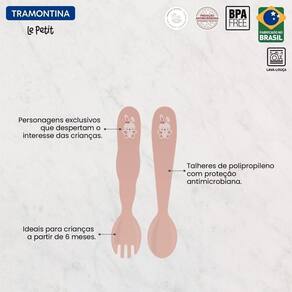 O jogo de talheres Infantil Tramontina Le Petit rosa 02 peças vai tornar a refeição do seu bebê muito mais especial e instigante. Os talheres do jogo são produzidos em polipropileno e todos contam com proteção antimicrobiana que inibe o crescimento de fungos e bacterias durante toda sua vida util. Deixe a rotina alimentar do seu bebê muito mais divertida e gostosa com a Tramontina!OrientaçõesTalheres de polipropileno com proteção antimicrobiana incorporada no processo de injeção que dura por toda vida útil do produto, inibindo o crescimento de bactérias e fungos.