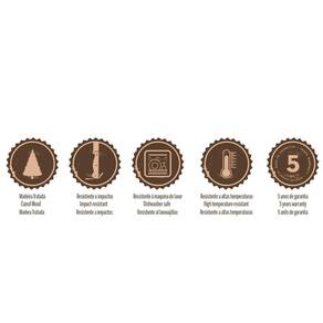 Lâminas de aço inox. As lâminas das facas têm maior durabilidade do fio devido ao tratamento térmico. As lâminas dos garfos contam com maior espessura e uma estampagem do aço que garante maior resistência, evitando deformações. Os cabos de madeira tratada Polywood são resistentes à impactos e alta temperaturas garantindo maior resistência e durabilidade. Rebites de alumínio. Podem ir à máquina de lavar louças facilitando seu dia a dia.