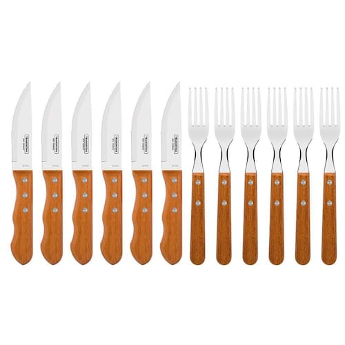 Com o Jogo de Talheres Jumbo para Churrasco Tramontina com Lâminas em Aço Inox e Cabos em Madeira Natural 12 Peças, você terá os itens perfeitos para saborear aquele churrasco em família! Eles combinam com qualquer ambiente e ainda deixam a hora da refeição mais bonita e charmosa, pois os cabos são produzidos em madeira natural com acabamento polido. As lâminas são em aço inox e contam com um fio de alta durabilidade devido ao tratamento térmico a que foram submetidas. Garanta o seu jogo e deixe seu churrasco ainda mais especial e completo!
