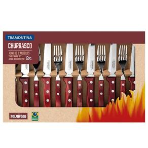 DESCRIÇÃO DO JOGO DE TALHERES JUMBO TRAMONTINA - O churrasco na sua casa vai atingir um nível superior com o jogo de talheres jumbo Tramontina Churrasco com lâminas em aço inox e cabos de madeira tratada polywood vermelho 12 Peças. - São 12 peças perfeitas para serem usadas para servir as melhores carnes aos seus convidados. - Os cabos de madeira tratada Polywood garantem mais resistência a impactos e a altas temperaturas. - Além disso, levam mais beleza à mesa, devido a sua cor vibrante. Produzidas com lâmina em aço inox, as facas possuem maior durabilidade do fio, pois recebem tratamento térmico. - Os garfos contam com lâminas de maior espessura e uma estampagem do aço que garante maior resistência, evitando deformações. - São fáceis de limpar, podendo ir à máquina de lavar louças.