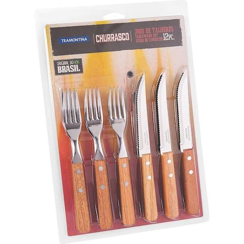 Beleza que se vê na mesa. Este jogo é composto de garfos e facas, ideais na hora de apreciar uma carne macia e saborosa que acabou de sair do fogo, como também linguiça, coração, dentre outras comidas servidas no churrasco. Tendo cabo em madeira e corpo em inox, são mais resistentes e proporcionam manuseio seguro. Servem até 6 pessoas ao mesmo tempo.EspecificaçõesNúmero de peças:12Tipo de embalagem:BlisterServe:6 pessoasPeso do produto na embalagem:410 gMarca:TramontinaGarantia:3 mes(es)Referência:Ref.: 22399/030Material:Cabo: Madeira, InoxComposição do faqueiro:Faca para churrasco: Quantos: 6, Garfo de mesa: Quantos: 6Cores disponíveis:Marrom