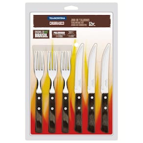 Na sua mesa não pode faltar o Jogo de Talheres para Churrasco Tramontina em Aço Inox com Cabo Castanho Polywood 12 Peças. A melhor opção para quem busca por peças de qualidade com um design diferenciado, oferecendo uma experiência perfeita para apreciar um verdadeiro churrasco. O jogo da linha Churrasco conta com garfos e facas produzidas com lâminas em aço inox duráveis, com belíssimos cabos de madeira tratada Polywood, que proporcionam resistência à impactos e altas temperaturas. A escolha certa para fazer sempre bonito. Orientações Lâminas de aço inox. As lâminas das facas têm maior durabilidade do fio devido ao tratamento térmico. As lâminas dos garfos contam com maior espessura e uma estampagem do aço que garante maior resistência, evitando deformações. Os cabos de madeira tratada Polywood são resistentes à impactos e alta temperaturas garantindo maior resistência e durabilidade. Rebites de alumínio. Podem ir à máquina de lavar louças facilitando seu dia a dia. Características Gerais EAN13 7891112111653 DUN14 17891112111650 NCM 8215.20.00 Peso Líquido 0,3870 kg. Peso Bruto 0,4700 kg. Metragem 0,002839 m³. Dimensões Embalagem (Compr. X Larg. X Alt.) 38x 225x 332 mm. Cor 1 4E3629 Hexa Observações Tenha cuidado ao manusear produtos cortantes e perfurantes e mantenha-os fora do alcance das crianças. Para maior durabilidade dos produtos recomenda-se secar bem antes de guardar. Para descarte dos produtos e embalagens siga as orientações de reciclagem vigentes.