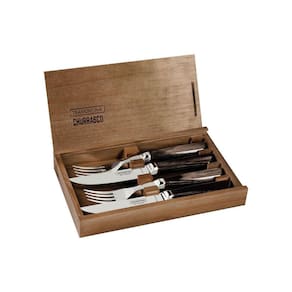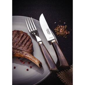 Lâminas de aço inox forjado.As lâminas das facas têm maior durabilidade do fio devido ao tratamento térmico.A lâmina do garfo conta com maior espessura e uma estampagem do aço que garante maior resistência, evitando deformações.Os cabos de madeira tratada Polywood são resistentes à impactos e alta temperaturas garantindo maior resistência e durabilidade.Estojo de madeira que oferece uma proteção as peças, permitindo o transporte e armazenagem com maior segurança.Podem ir à máquina de lavar louças facilitando seu dia a dia.