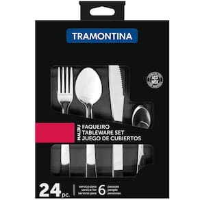 Pequenos cuidados com seu lar fazem toda a diferença. #Faqueiro Tramontina 24 Peças #Facas com Excelente Corte #Faqueiro Aço Inox Garantia: 90 dias / Peso: 590g / Cor: Inox / Ref: 23798046 Dimensões das Facas: 20,5cm (C) x 1,5cm (L) Dimensões dos Garfos: 18,5cm (C) x 2,5cm (L) Dimensões das Colheres de Mesa: 18,5cm (C) x 4cm (L) Dimensões das Colheres de Café: 12,5cm (C) x 2,5cm (L) Facas: possuem têmpera de excelente qualidade, garantindo bom corte e grande retenção de fio. Cuidados: Não lavar com materiais abrasivos. Conteúdo: - 6 Facas para Churrasco 4"; - 6 Garfos de Mesa; - 6 Colheres de Mesa; - 6 Colheres para Chá. Material: - Aço Inox: Material altamente resistente à ferrugem mantém o fio por muito tempo e possui grande durabilidade. Este faqueiro de 24 peças irá compor sua mesa deixando-a mais bonita e elegante, podendo ser utilizado tanto para refeições rotineiras quanto para os momentos especiais. Um faqueiro totalmente produzido em aço inox que oferece durabilidade e resistência, além de deixar sua mesa muito mais elegante e cheia de estilo, pois suas peças contam com um acabamento que tornam o talher ainda mais especial. Muito fáceis de limpar, o jogo de talheres Tramontina pode ir à máquina de lavar louças e serve até 6 pessoas.