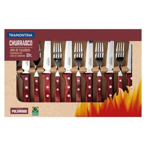 O churrasco na sua casa vai atingir um nível superior com o jogo de talheres jumbo Tramontina Churrasco com lâminas em aço inox e cabos de madeira tratada polywood vermelho 12 Peças. São 12 peças perfeitas para serem usadas para servir as melhores carnes aos seus convidados. Os cabos de madeira tratada Polywood garantem mais resistência a impactos e a altas temperaturas. Além disso, levam mais beleza à mesa, devido a sua cor vibrante. Produzidas com lâmina em aço inox, as facas possuem maior durabilidade do fio, pois recebem tratamento térmico. Os garfos contam com lâminas de maior espessura e uma estampagem do aço que garante maior resistência, evitando deformações. São fáceis de limpar, podendo ir à máquina de lavar louças.