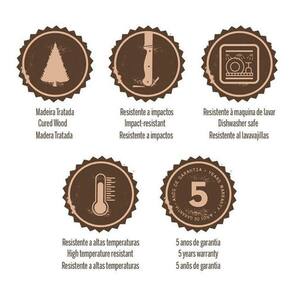 Lâminas de aço inox. As lâminas das facas têm maior durabilidade do fio devido ao tratamento térmico. As lâminas dos garfos contam com maior espessura e uma estampagem do aço que garante maior resistência, evitando deformações. Os cabos de madeira tratada Polywood são resistentes à impactos e alta temperaturas garantindo maior resistência e durabilidade. Rebites de alumínio. Podem ir à máquina de lavar louças facilitando seu dia a dia.