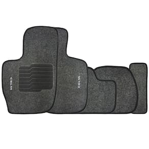 Especificações - Carpete agulhado de 05 mm em fibra de PET e resina sintética. - Acabamento em viés preto - Sistema de segurança aderente - Base resinada. - Bordado com a i d e n t i f i c a ç ã o do veículo - Modelagem específica