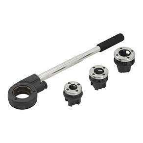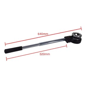 Possui tarraxas reforçadas com base em ferro fundido, cossinetes intercambiáveis em aço temperado proporcionando maior resistência e durabilidade. Conta com porta-tarraxas em ferro fundido com sistema de catraca e botão de reversão permitindo selecionar o sentido de trabalho e guia de posicionamento do cano conferindo maior precisão. Possui ainda cabo bipartido, com encaixes roscados, em estrutura metálica tubular com empunhadura emborrachada que proporciona maior conforto no manuseio.