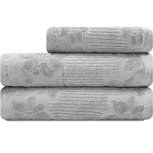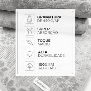 De um lado, apresentam textura atoalhada; do outro, acabamento aveludado com toque sedoso — ambos com super absorção. O design moderno combina acabamento em jacquard com estampas em relevo por toda a peça e barrado com detalhes florais.