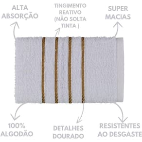 O tingimento é reativo deixando a Toalha Montreal com cores modernas e vivas, por ser reativo não tem o risco de soltar tinta. Essa toalha contém a barra decorada em dourado para dar um toque de modernidade e luxo ao seu Ambiente.