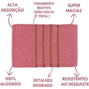 O tingimento é reativo deixando a Toalha Montreal com cores modernas e vivas, por ser reativo não tem o risco de soltar tinta. Essa toalha contém a barra decorada em dourado para dar um toque de modernidade e luxo ao seu Ambiente.