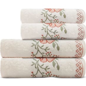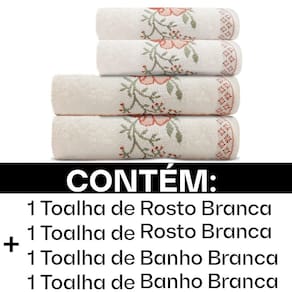 Este kit contém: 02 Toalhas de Banho (70cm x 135cm); 02 Toalhas de Rosto (50cm x 80cm). Características: 96% Algodão, 4% Poliéster; Gramatura: 430g/m²; Pré-encolhida e com acabamento antipilling; Toque super macio e ótima absorção. Instruções de Lavagem: Lavar com temperatura máxima de 40°C; Não alvejar; Secar em temperatura baixa; Passar com temperatura máxima de 150°; Não limpar a seco.
