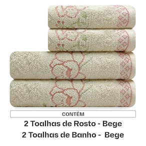 Este kit contém: 02 Toalhas de Banho (70cm x 135cm); 02 Toalhas de Rosto (50cm x 80cm). Características: 96% Algodão, 4% Poliéster; Gramatura: 430g/m²; Pré-encolhida e com acabamento antipilling; Toque super macio e ótima absorção. Instruções de Lavagem: Lavar com temperatura máxima de 40°C; Não alvejar; Secar em temperatura baixa; Passar com temperatura máxima de 150°; Não limpar a seco.