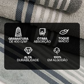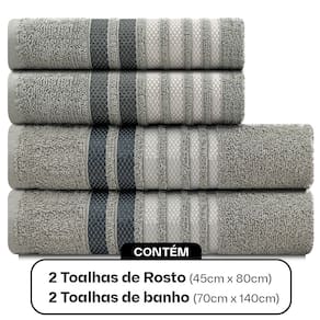 Este jogo contém 4 peças: 02 Toalhas de Rosto (45cm x 80cm) 02 Toalhas de Banho (70cm x 140cm)