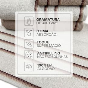 Características Rosto/Banho: Extra Maciez 100% Algodão (Exceto Barra Decorativa) Toque Macio Fio 24 Retorcido Boa Absorção Gramatura das toalhas: 390g/m³ Gramatura piso: 420g/m² - 100% Algodão