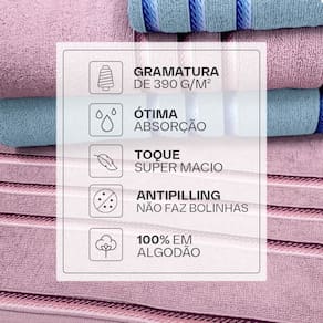 Feita 100% de algodão (exceto a barra decorativa), com gramatura de 390g/m², oferece uma experiência única de relaxamento. O design minimalista e moderno traz sofisticação à decoração do seu banheiro. A escolha ideal para quem quer toalhas de qualidade!