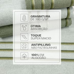 Feita 100% de algodão (exceto a barra decorativa), com gramatura de 390g/m², oferece uma experiência única de relaxamento. O design minimalista e moderno traz sofisticação à decoração do seu banheiro. A escolha ideal para quem quer toalhas de qualidade!