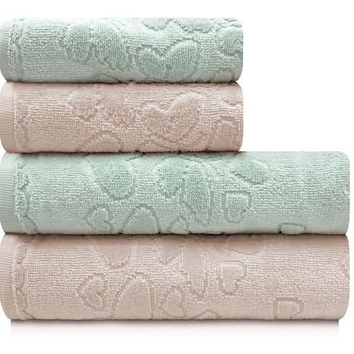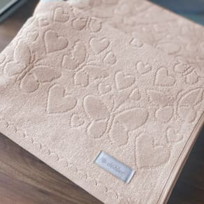 O tecido em Jacquard aveludado possui um design de corações e borboletas em alto relevo que adiciona um visual elegante e delicado às peças, conferindo um charme especial ao seu banheiro.