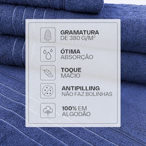 Tecnologia Softmax: mais maciez e absorção Fios penteados: maior durabilidade Tecido pré-encolhido e antipilling (evita bolinhas) Alta absorção e toque delicado