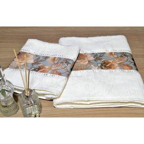 Toalhas felpuda aveludada,da marca Brutextil, na cor palha, com barrado digital e estampa de passarinhos , em tons de marrom e cinza azulado.