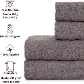 Conteúdo: Jogo com 4 peças - 2 Banho 2 RostoGramatura: 430 g/mPeso Aproximado da Toalha de Banho: 490 a 510 GramasPeso Aproximado da Toalha de Rosto: 160 a 180 GramasTamanho da Toalha de Banho: 80x150 cmTamanho da Toalha de Rosto: 45x80 cmColeção: Itália SoftFio: 16/1 SingeloMaterial: 100% Algodão