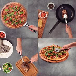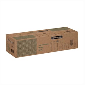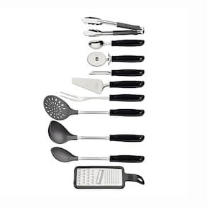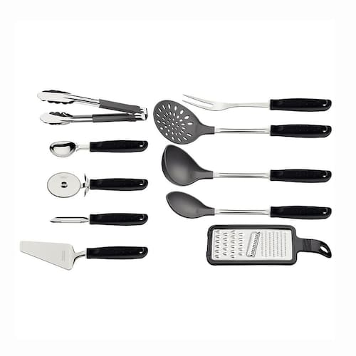 - Composição do Conjunto: 1 Espátula, 1 Concha, 1 Colher de Servir, 1 Pegador de Massa, 1 Garfo Trinchante, 1 Descascador, 1 Cortador de Pizza, 1 Pá para Bolo, 1 Ralador com três tipos de corte, 1 Pegador Universal;
