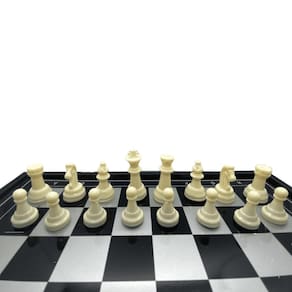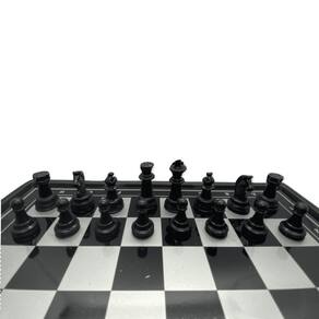 Tabuleiro em plástico 19,5 x 19,5 cm, 16 peças claras e 16 escuras de plástico com imã na base. Tabuleiro dobrável com superfície metálica, nas bordas possui marcação numérica na vertical e alfabética na horizontal.