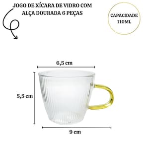 Informações Técnicas: Composição: Vidro. Capacidade: 110ml. Altura: 5,5cm. Largura com a alça: 9cm. Diâmetro da borda: 6,5cm. Diâmetro da base: 4cm. Peso de cada xícara: 53cm. Validade: indeterminada.