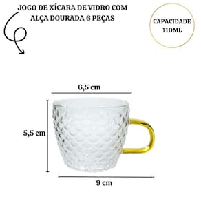 Informações Técnicas: Composição: Vidro. Capacidade: 110ml. Altura: 5,5cm. Largura com a alça: 9cm. Diâmetro da borda: 6,5cm. Diâmetro da base: 4cm. Peso de cada xícara: 53cm. Validade: indeterminada.